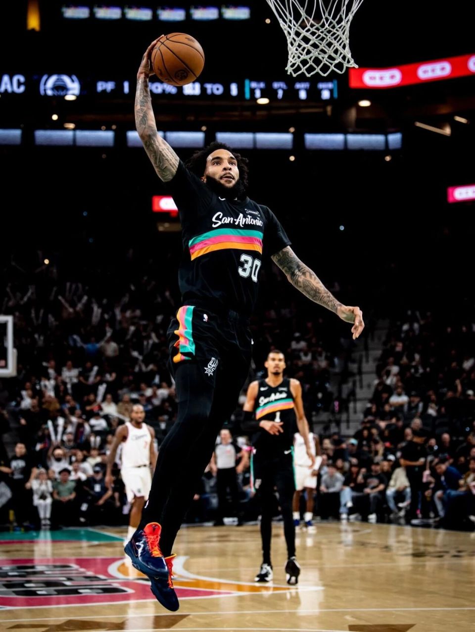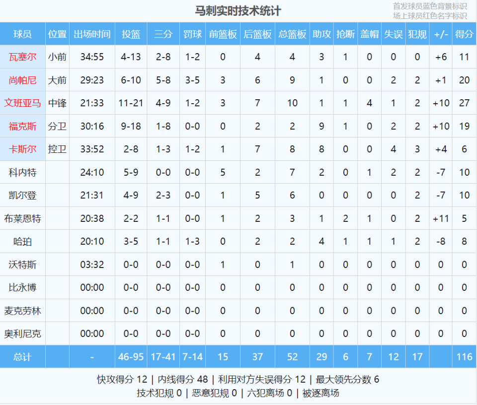 马刺两个首发后卫,上半场如同梦游:卡斯尔5中1,福克斯6中1。这哥俩上半场合计11中2,仅得5分3失误。还得靠文班,第二节他依然只打了5分钟。上半场出战10分钟,13中5拿到14分6篮板1助攻1抢断1盖帽,正负值-2。