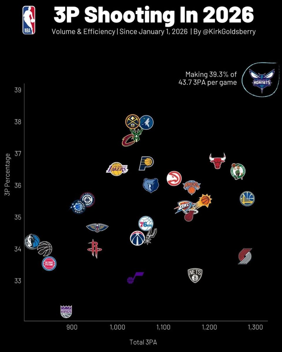 今天NBA官方公布最新一期的常规赛MVP榜单,前三名依然是亚历山大、约基奇和坎宁安。文班亚马第四,杰伦-布朗升至第五,东契奇跌至第六。下面这张图是进入2026年之后联盟各队三分表现:纵轴三分命中率、横轴三分出手数。