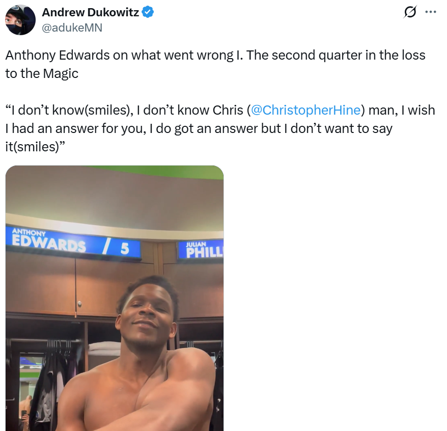 作为球队核心,赛后谈到球队第二节为何突然进攻断电时,爱德华兹笑着说自己不知道,然后话锋一转表示:“我其实是有答案的,但是我不能告诉你。”