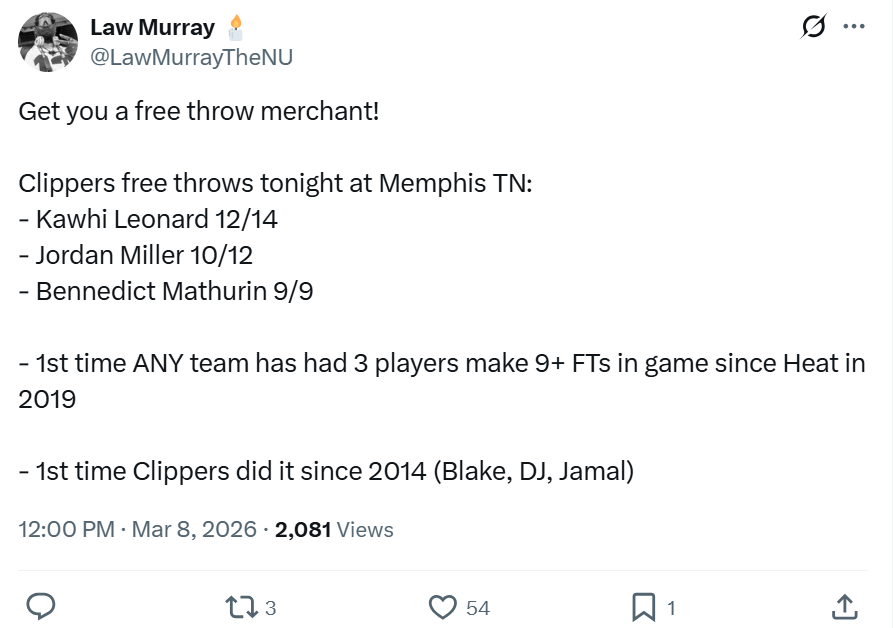 得益于几名新援的回暖,以及小卡的稳定输出,快船队本场获得45次罚球,创造快船近7年最佳,也让快船队在全场仅命中4记三分的情况下拿下胜利。