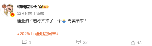 媒体人“麦穗丰”发文点评:有决心,有实力,有热情,有技术!徐杰再次证明了,身高其实也不是什么问题,在精神上成为巨人,一样能够获得非凡的成就!恭喜徐杰,2026年CBA全明星正赛MVP!
