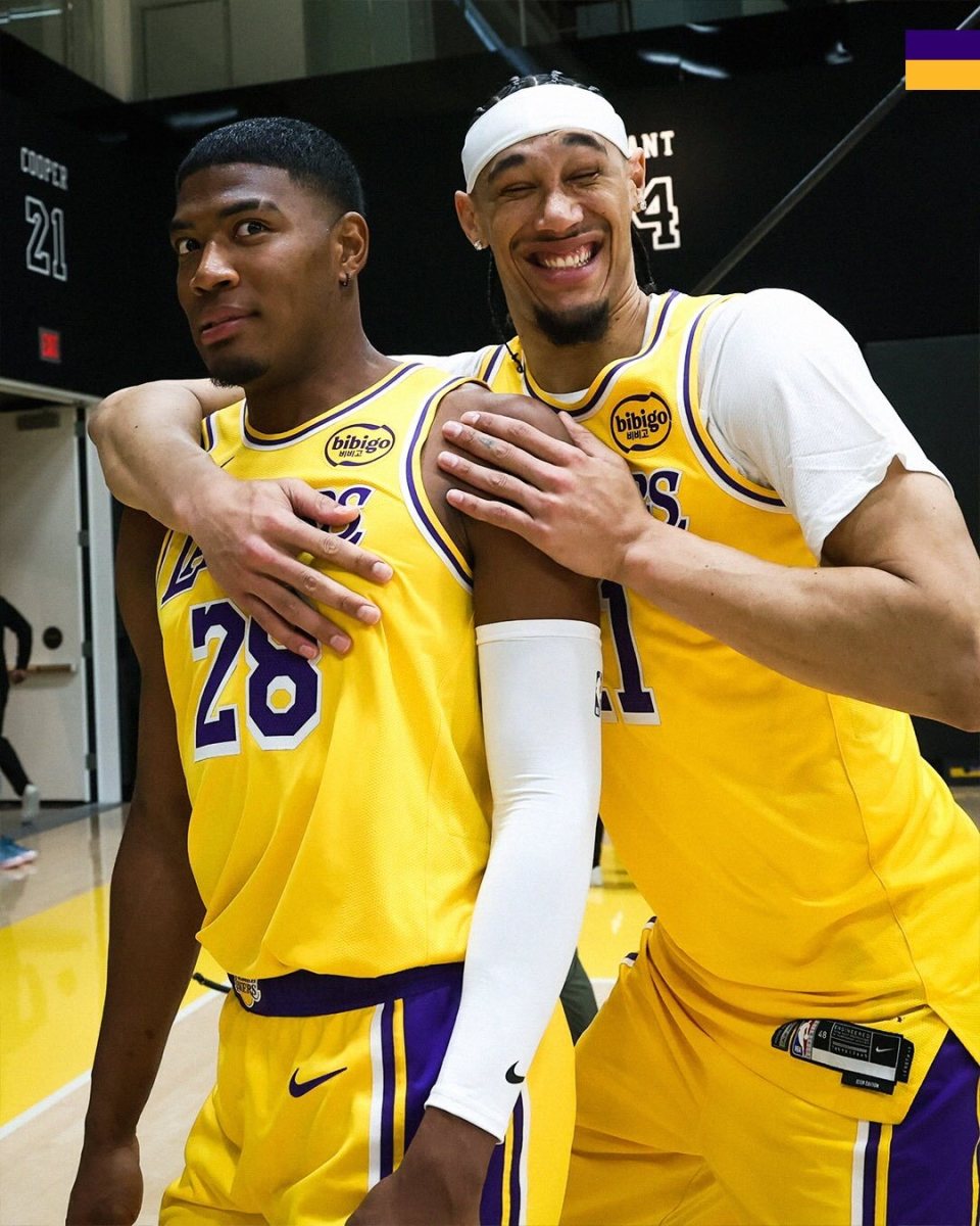 湖人拍摄全家福!东契奇搞怪把名字贴额头 詹姆斯布朗尼笑容满面