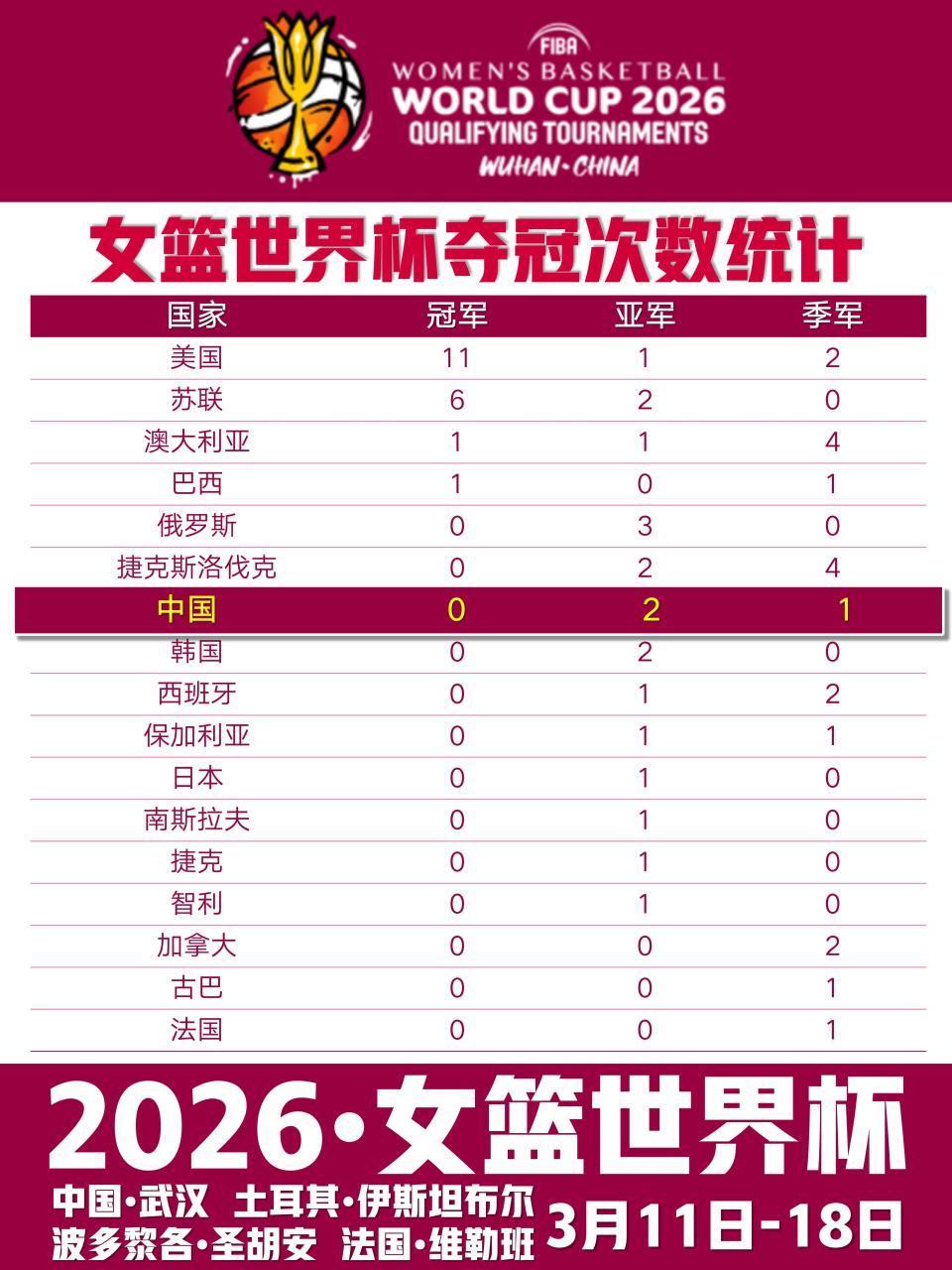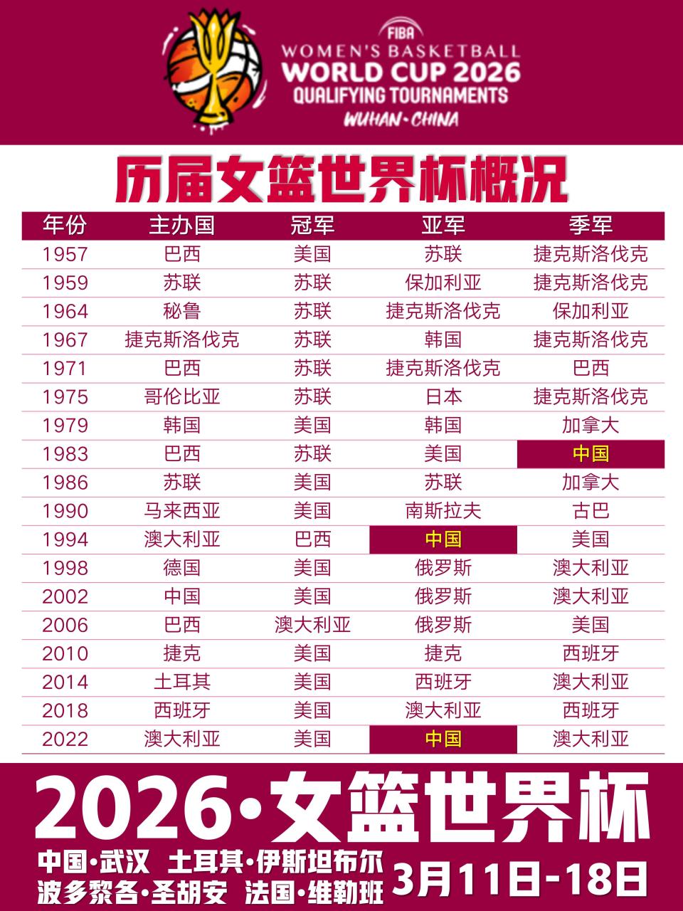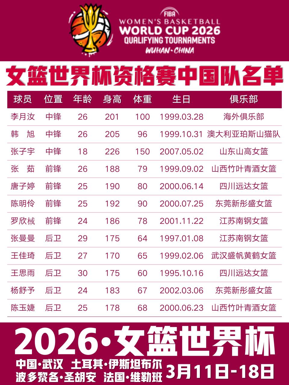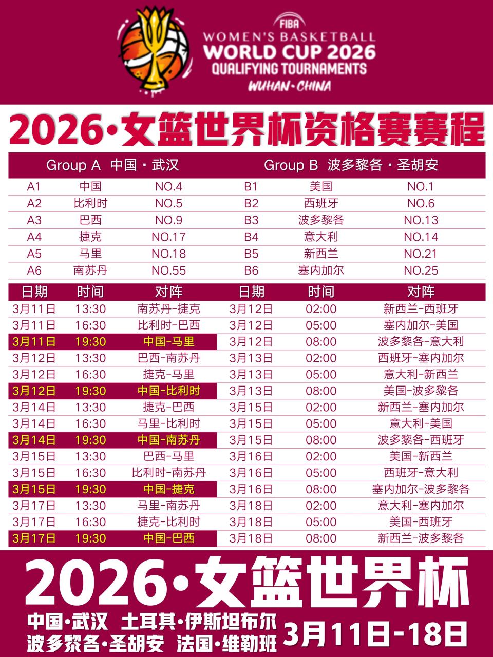 3月11日至18日,2026年女篮世界杯资格赛将在全球四大赛区同步打响。作为上届世界杯亚军、目前世界排名第四的中国女篮,将在主场武汉赛区开启冲击柏林世界杯的征程。由李月汝、韩旭领衔,加之18岁新星张子宇首次亮相成年组国际赛事,中国女篮此次的目标不仅是稳稳拿下正赛名额,更希望通过实战磨合阵容、提升外线实力,为9月柏林世界杯蓄力。