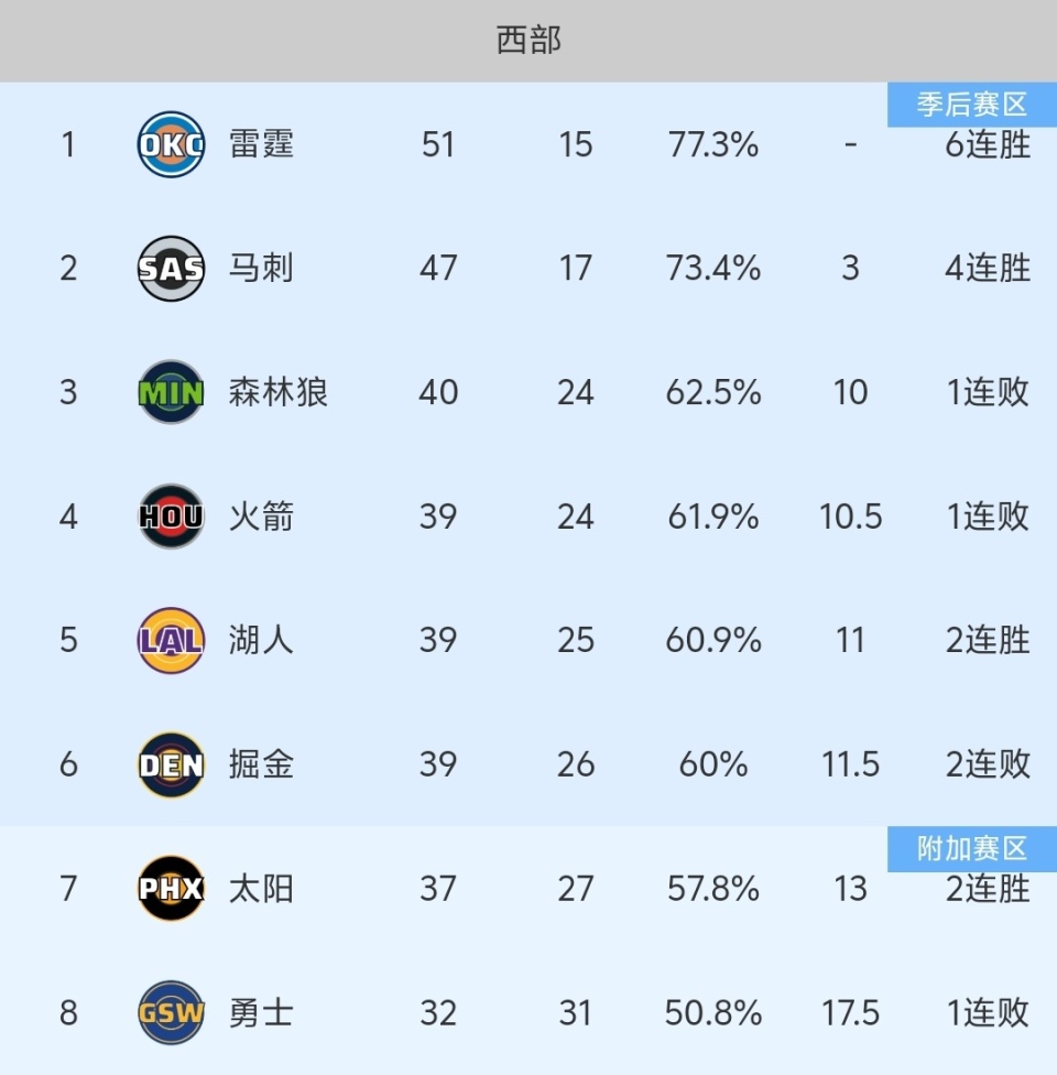 随着掘金126-129被绝杀,火箭湖人利好,NBA最新积分榜出炉!