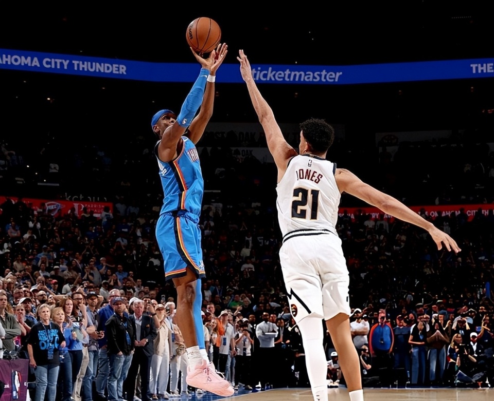 掘金队全军出击,体型优势尽显无疑。全场比赛下来,掘金队篮板球56-37赢了雷霆队19个,前场篮板16-3赢了雷霆队13个,内线得分(54-48)和二次进攻得分(29-7)完爆雷霆队。掘金队拳拳到肉,可他们还是打不死对手,关键在于雷霆队做好了两件事。第一,雷霆队在三分线外惩罚了掘金队收缩的防线,全队三分球47投19中,命中率高达40.4%。第二,雷霆队进攻运转太稳了,全队全场仅出现3次失误,刷新联盟本赛季单场失误数纪录,掘金队很难打出自己最擅长的快攻反击。