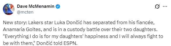 ESPN消息人士则透露,东契奇于2月26日向斯洛文尼亚法院申请了一项临时禁令,要求立即与两个女儿Gabriela和Olivia取得联系。