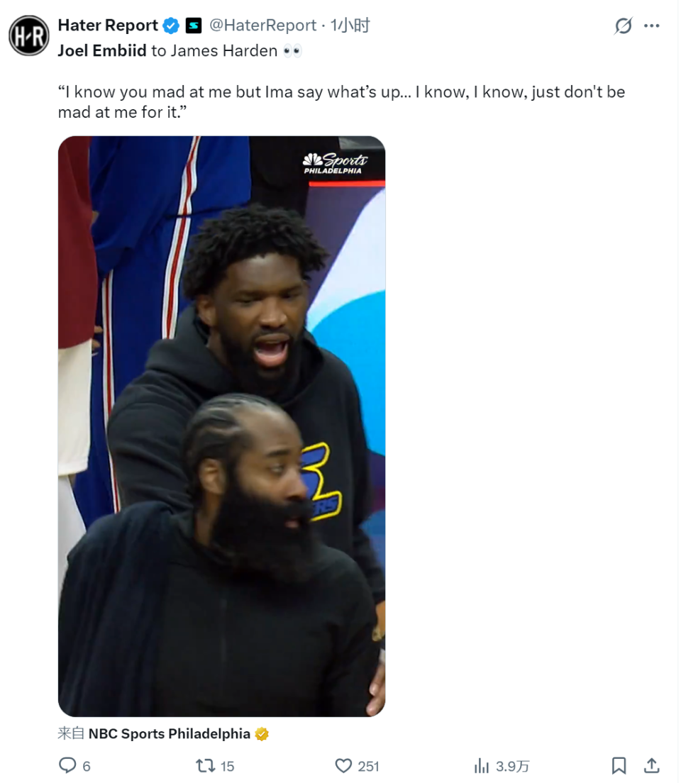 0交流0联系!恩比德主动道歉!哈登原谅他了