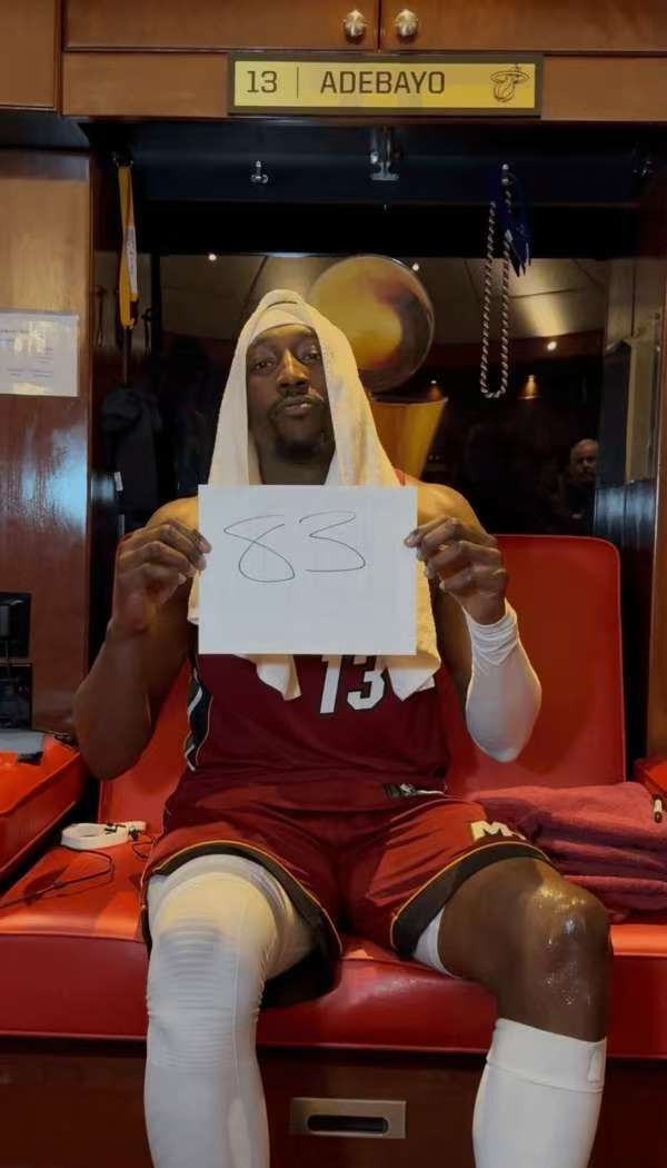 赛后的更衣室里,巴姆·阿德巴约坐在板凳上,盖着毛巾,目光有些失神,又有些小骄傲,双手把一张写着数字“83”字样的白纸展在胸前,任由记者一通狂拍。
