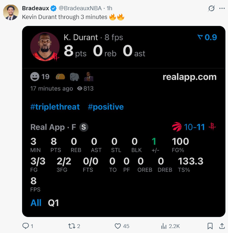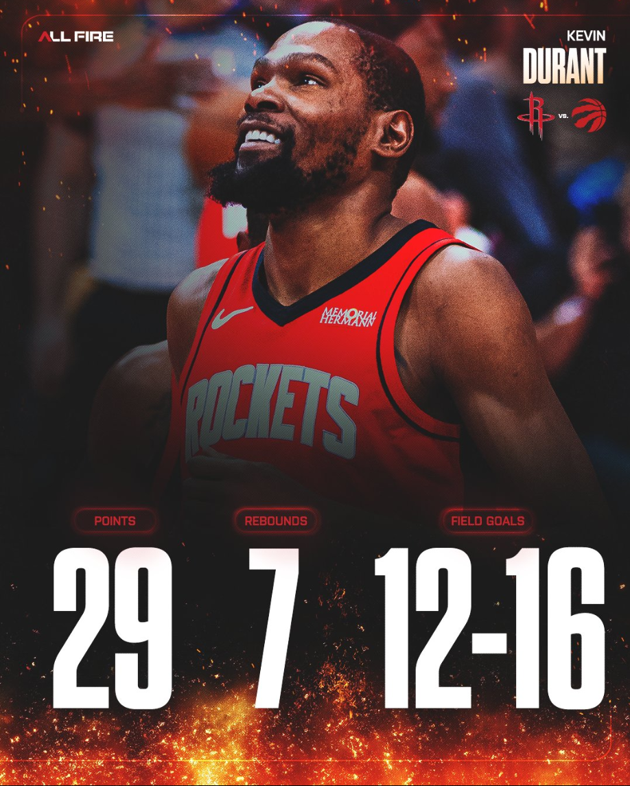 末节杜兰特都还没有登场,依靠小贾连拿8分帮助火箭拉开分差,末节KD只打了2分钟拿到2分2篮板1助攻1盖帽就打卡下班了,全场比赛33分钟,16中12,三分5中4,罚球2中1拿到29分7篮板2助攻2抢断2盖帽,命中率75%,三分命中率80%,真实命中率85.9%。