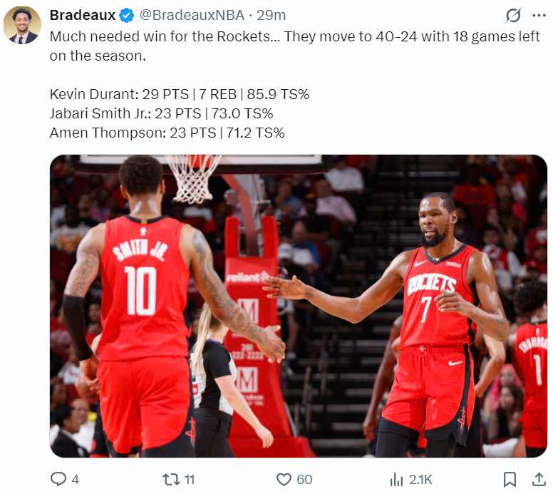 轰29+7助火箭取第40胜!杜兰特终露甜美笑容 赛后盛赞热巴盖世伟业