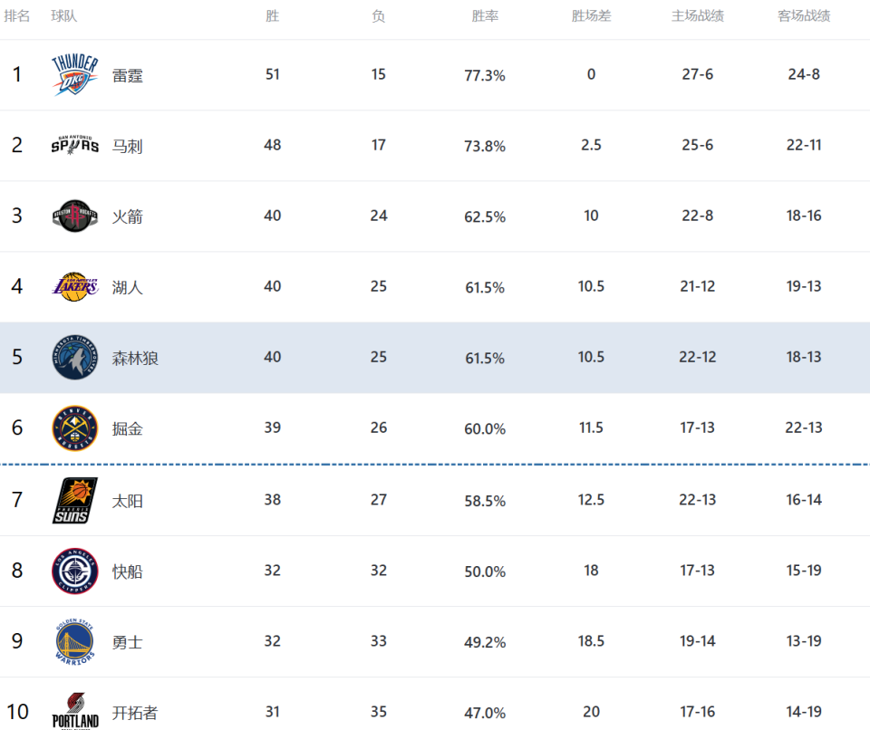 现在的西部完全可以分成三个阶层:雷霆和马刺竞争前二,火箭、湖人、森林狼、掘金和太阳,竞争第三,勇士、快船和开拓者全力冲击第八。话说到这,大家对于现在的西部排名有什么想说的?欢迎留言讨论。