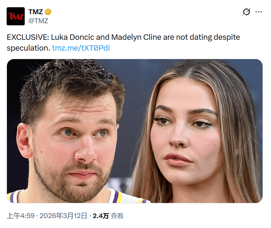 北京时间3月12日,NBA常规赛继续进行。在今天早些时候,著名媒体TMZ报道了湖人队球星东契奇与未婚妻戈尔特斯的情况,并表示东契奇与女演员玛德琳-克莱因并无关系。