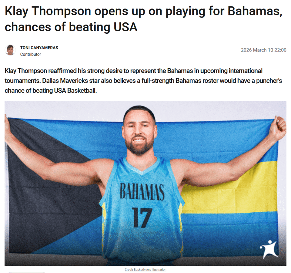 北京时间3月12日,NBA常规赛继续进行。在今天早些时候,独行侠队球星汤普森表示希望能在未来的国际赛场上身披巴哈马男篮战袍出战。同时汤普森直言,若巴哈马男篮能全员集结,他们有实力在大赛中向实力强劲的美国队发起挑战,甚至有望实现击败美国队的突破。
