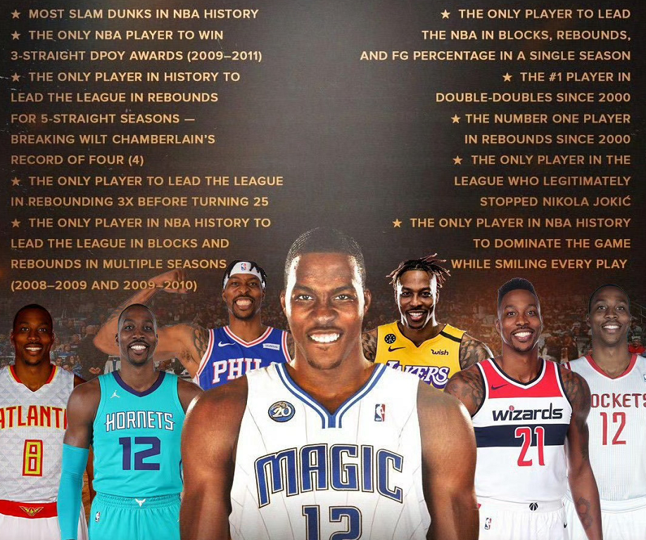 霍华德是2004年NBA状元秀,一个让姚明头疼的肌肉猛男,一个能单换詹姆斯的天赋怪,一个让23VS24巅峰对决胎死腹中的终结者。整个NBA生涯,霍华德先后效力过魔术、湖人、火箭、老鹰、黄蜂、奇才和76人等球队,他还一度在淡出NBA联盟之后不远万里前往宝岛台湾省联赛捞金,万人空巷,仿佛超人降临。