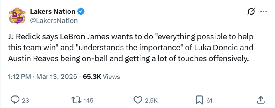 对此,赛后雷迪克称赞道:“勒布朗渴望胜利,他愿意尽一切可能帮助球队赢球,哪怕角色有所调整,在东契奇加盟后,他已经做出了不少的牺牲,但他还是明白让东契奇和里夫斯有更多持球时间的重要性,这说明了他对球队的关心程度,以及对身旁队友的重视。”