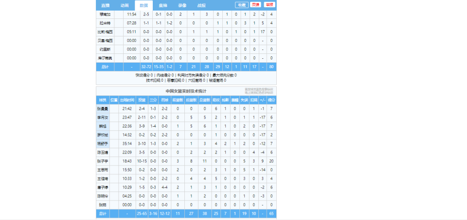 女篮世预赛第二轮,中国女篮65-80不敌比利时女篮。本场数据方面,中国队与比利时队的篮板数比为38-28,助攻数比为25-29,失误数比为19-11,三分命中数则为3-15。