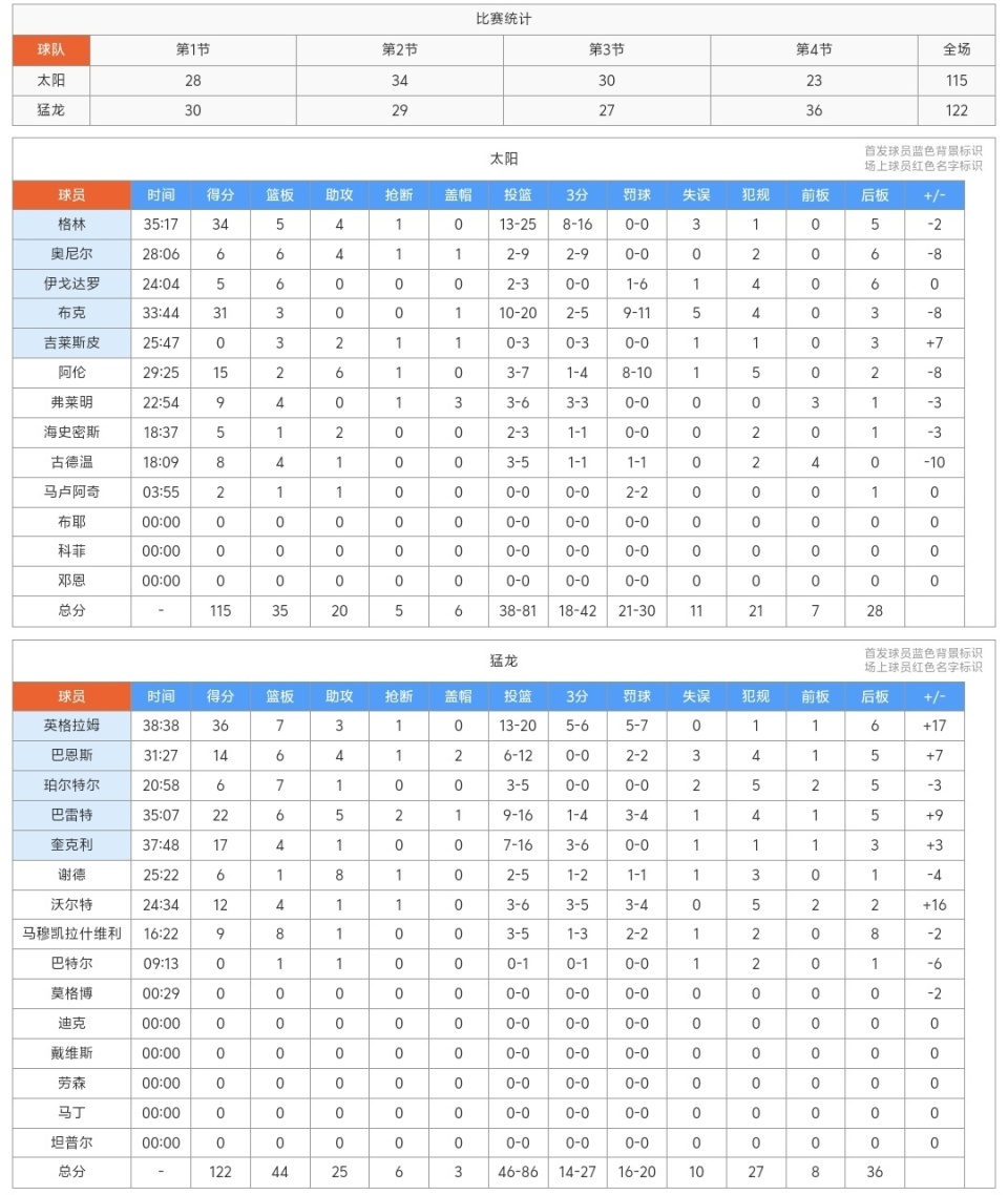 太阳115-122憾负猛龙,格林34+4,谁是输球罪魁?数据不会说谎!