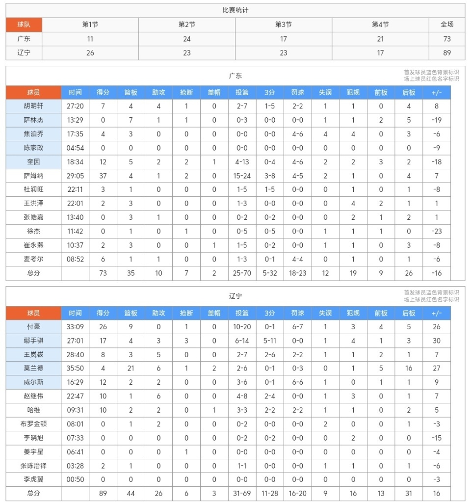 上半场广东队萨姆纳16分1板2断、奎因9分2板、麦考尔6分1板1助、胡明轩2分1板1助、焦泊乔2分1板、萨林杰7板1助、徐杰1板!辽宁队付豪15分5板、鄢手骐9分3板1助2断、赵继伟8分1板3助、威尔斯6分2板1助、王岚嵚5分1板5助、哈维4分2板1助、张陈治锋2分、莫兰德7板2助2帽、布罗金顿2助!