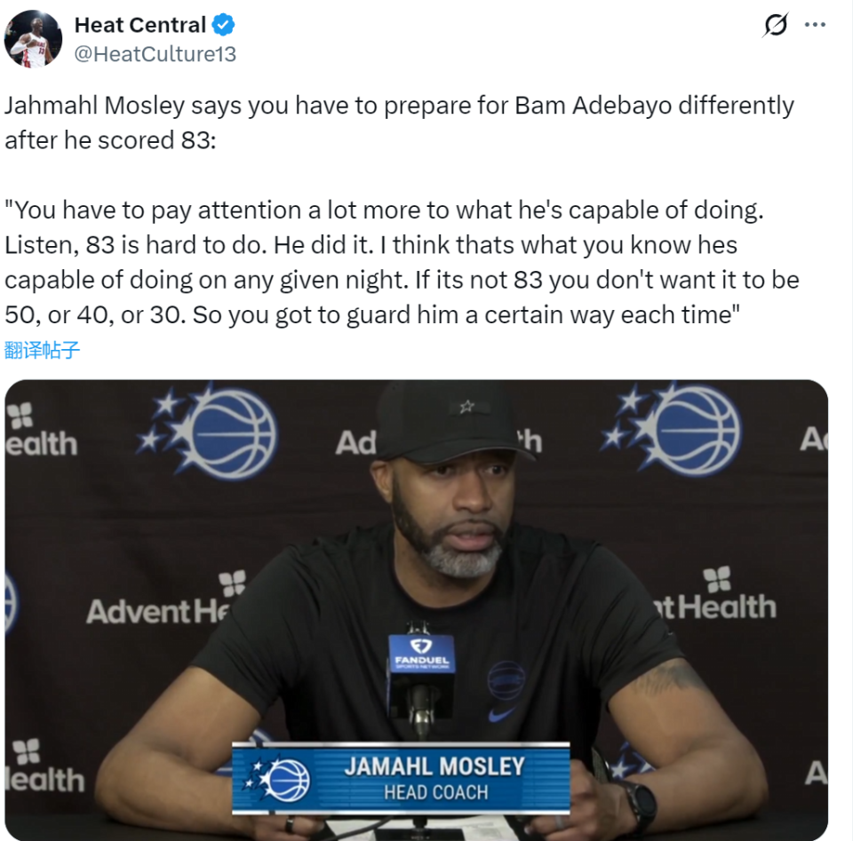 魔术主帅莫斯利赛后接受采访时说道:“阿德巴约任何一晚都可能爆发!就算不是83分,你也不想让他拿50分、40分或者30分。所以,我们每次都必须用特定的方式去防守他。”阿德巴约赛后对裁判不满:“他们的吹罚改变了比赛走势。”