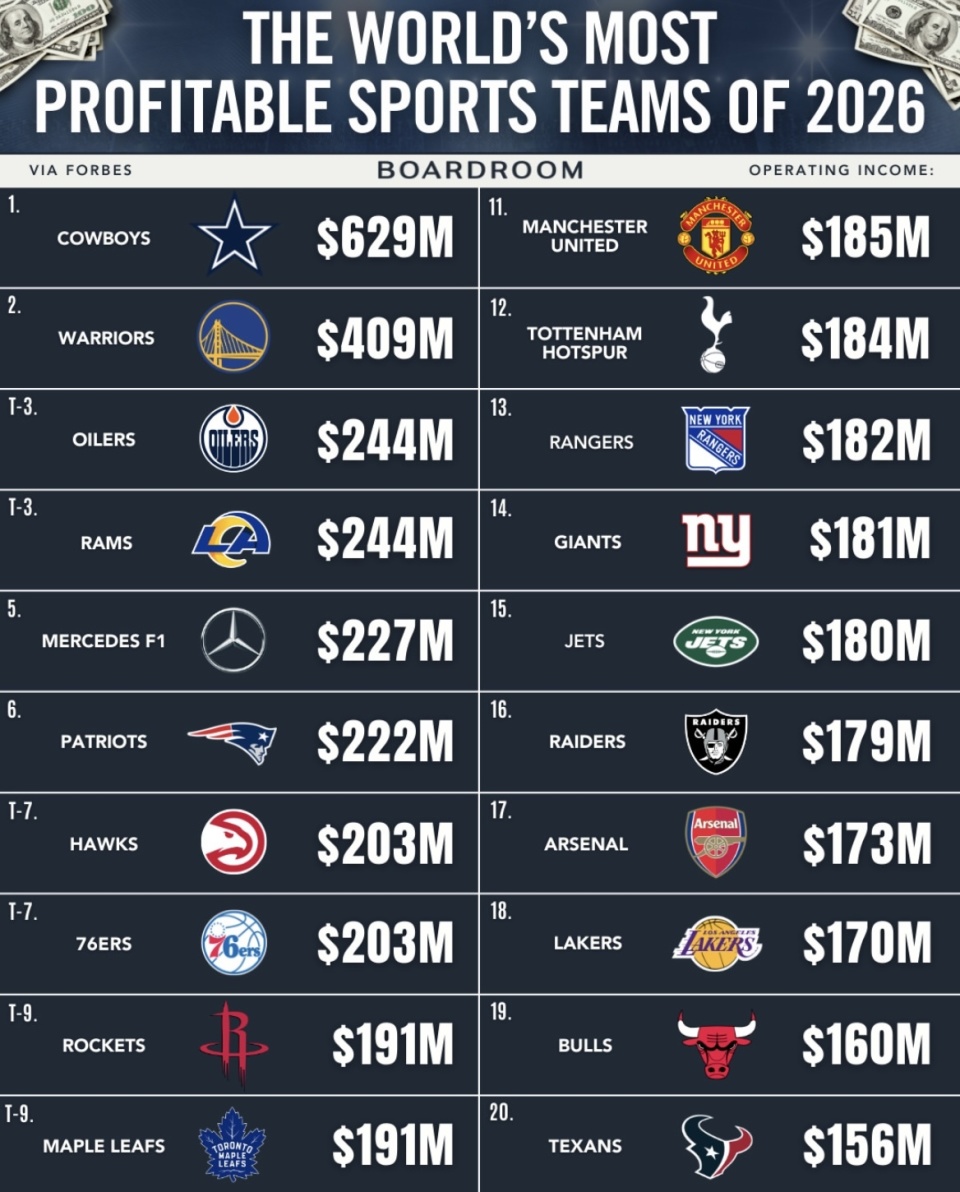 最近福布斯整理了2026年全球最赚钱体育队伍榜单。达拉斯牛仔以6.29亿美元运营收入高居第一,金州勇士排在第二,前十里大部分位置都被北美职业体育队伍占据。另一边,曼联、热刺、阿森纳这些全球知名的足球豪门都排在十名开外。名气都不小,吸金能力却没站到同一排,这份榜单先摆出来的反差,就已经很明显了。