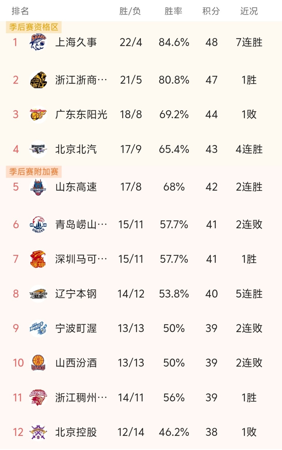 随着广厦87-72大胜,上海北京赢球,CBA最新积分榜:上海第一!