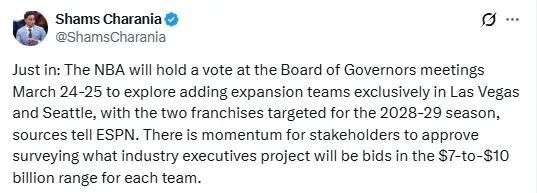 爆料王Shams:NBA将于3月24日至25日召开董事会会议,就在拉斯维加斯和西雅图两地新增两支球队的议题进行投票表决。