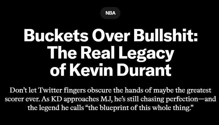 杜兰特就是这种沉浸的丰碑。他在篮球路上追求的境界,对大多数人遥不可及,对其他人更是难以想象。过去十年,杜兰特最大的执念就是打磨技艺——完全掌控自己在场上的一切。他从未停止追逐完美,哪怕不在意代价。