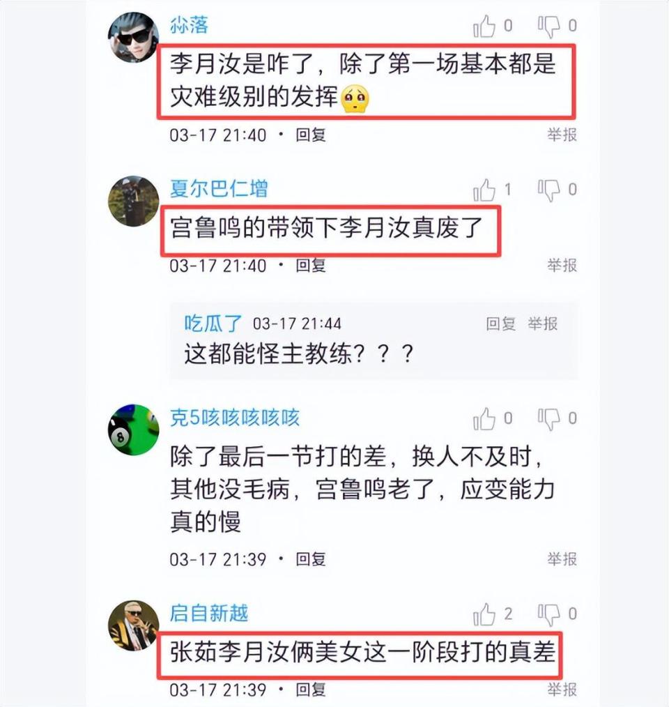 奇怪的是,在赛后采访中,李月汝怪教练宫鲁鸣不会用她,她也不解教练的战术。她原话这样说:“可能需要我们教练更清楚怎么把我放在更合适的位置,我也需要跟教练主动去沟通我应该在怎么样的时机出现在怎么样的位置,确实后面这几场球我也打得很别扭,我自己也打得不太高兴。”