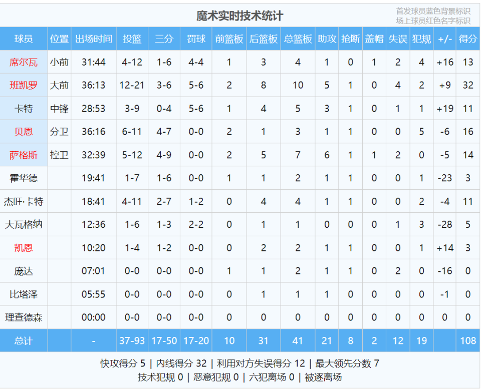 魔术状元班凯罗打了36分钟,投篮21中12,三分6中3,罚球6中5,砍下32分10篮板5助攻1抢断4失误,正负值+9。第四节班凯罗独得15分,依然无力回天。贝恩11投6中,拿到16分3篮板。霍二叔的儿子杰特-霍华德7中1仅得3分!