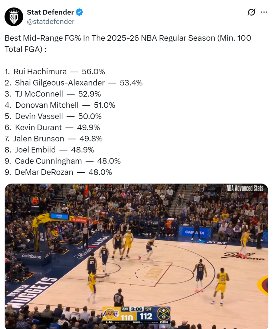 亚历山大连续129场砍下20+,继续刷新自己创造的NBA历史纪录。以雷霆的战绩还有亚历山大的数据,他要蝉联常规赛MVP了。再看一组数据,本赛季中距离跳投命中率,亚历山大53.4%排名联盟第二,仅次于八村塁(56%)。