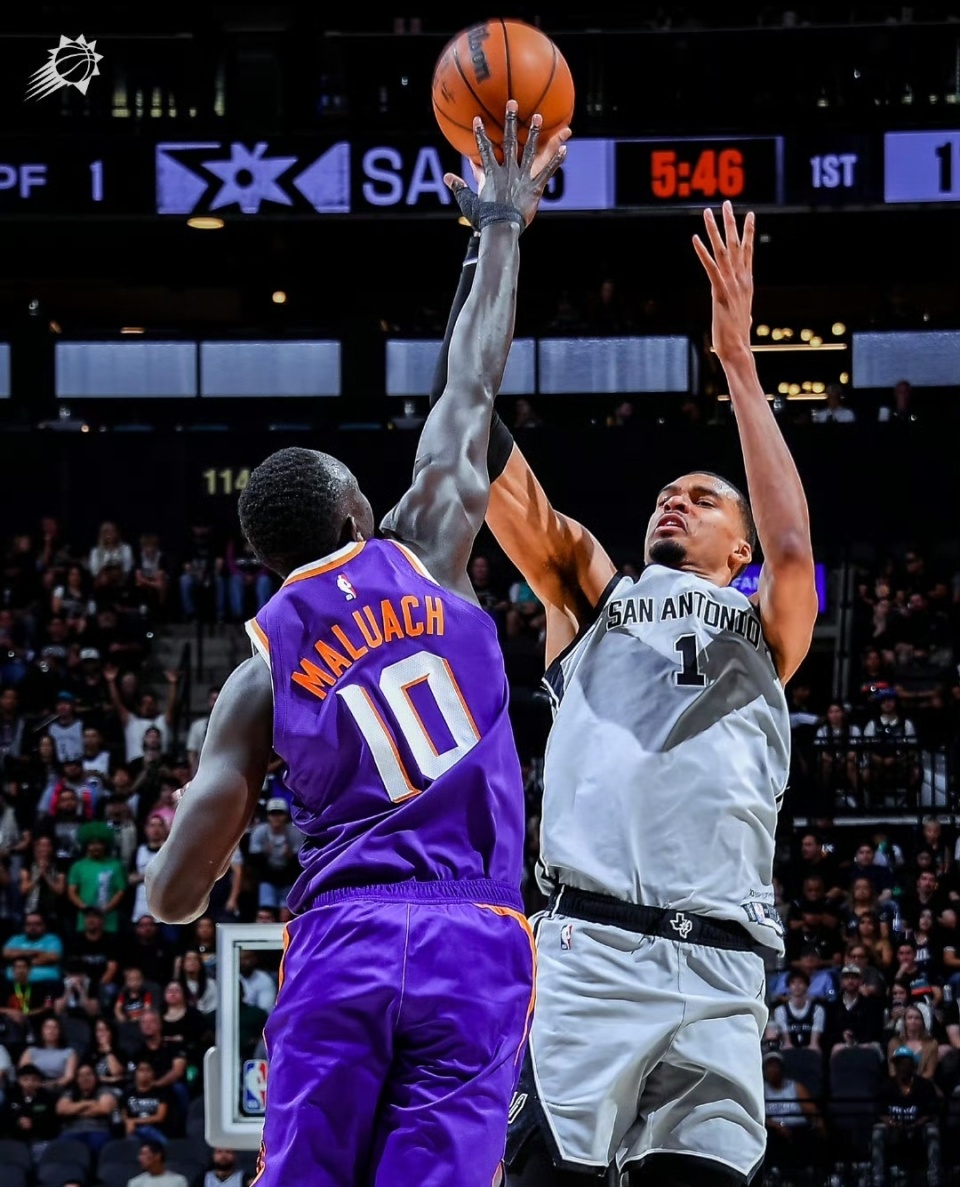 第二节文班亚马火力全开,单节独得10分,福克斯、瓦赛尔、尚帕尼都有发挥,不过太阳队吉莱斯皮直接暴走,三分线外非常精准,杰伦格林也有持续的贡献,布克则是继续打铁,中场休息时,太阳队59-52领先马刺,在客场和马刺打成这样,已经很不错了!