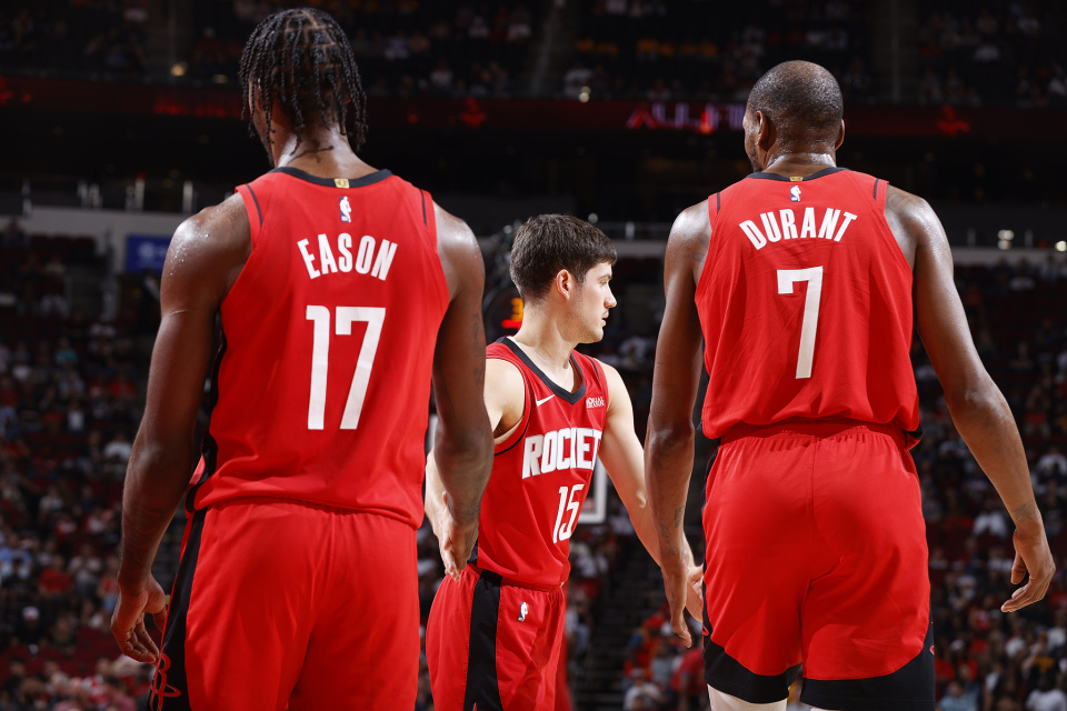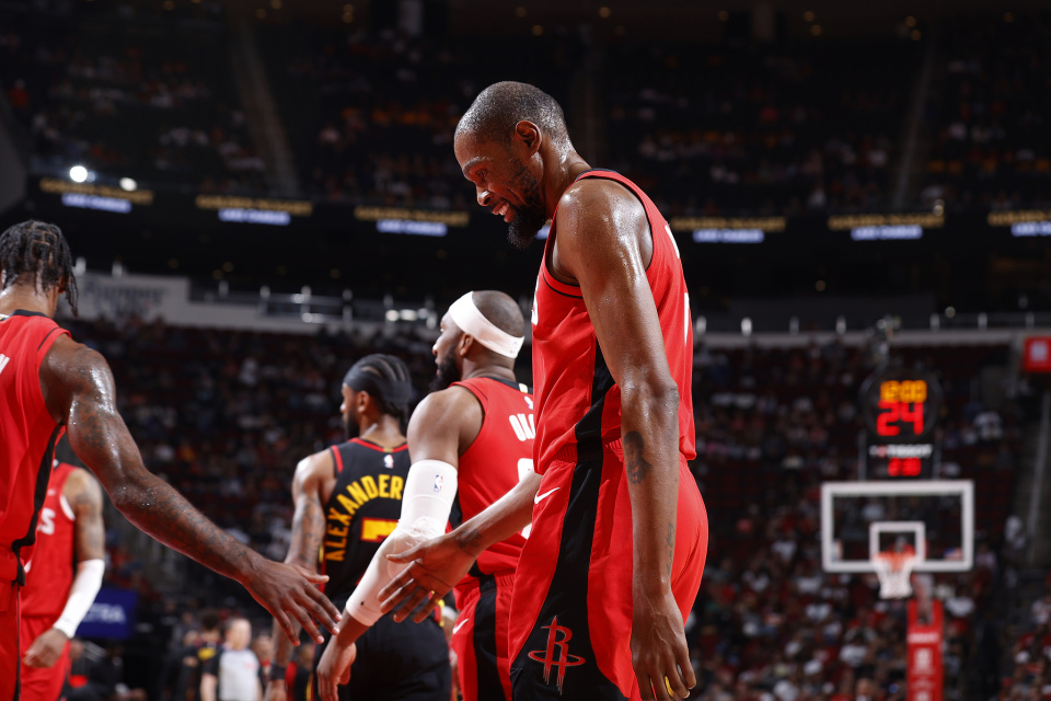 在申京扮演第一进攻发起点,同时身旁有谢泼德、霍勒迪与奥科吉控球的情况下,杜兰特终于不用再长时间控运,更多扮演无球终结点角色。
