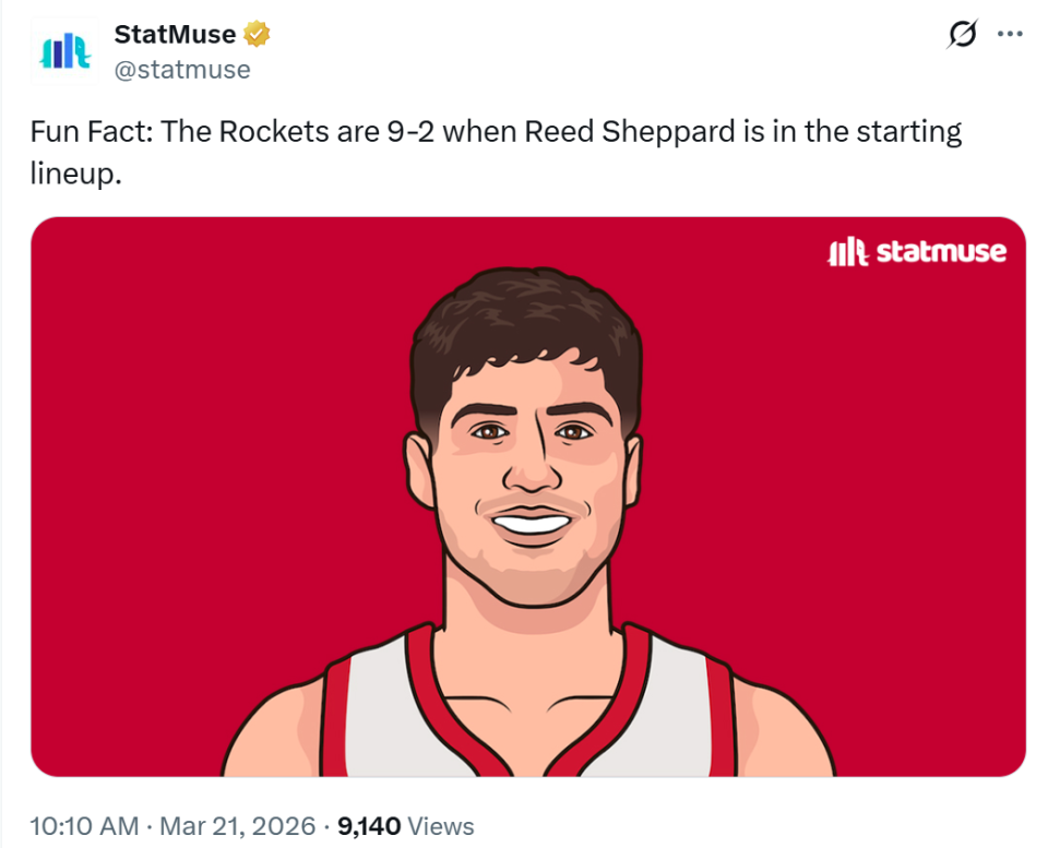 本场比赛取胜后,本赛季当谢泼德首发时,火箭队拿下11战9胜傲人表现,效果可谓是立竿见影,这套首发本场一共打了9分钟,期间火箭进攻效率120,防守效率100,净效率为夸张的+20。