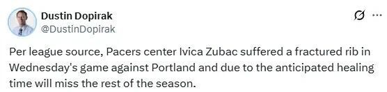 据供职于《印第安纳波利斯星报》记者Dustin Dopirak报道:祖巴茨因为肋骨骨折,提前结束本赛季征程。