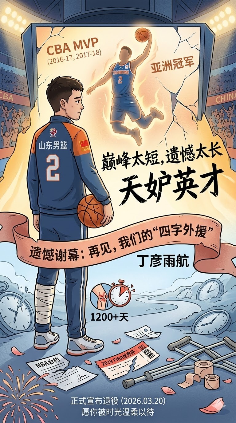 北京时间2026年3月20日,33岁的丁彦雨航回到了济南经十路那座熟悉的山东男篮主场球馆。在这个见证了他无数次绝杀、暴扣的空荡场馆里,他对着镜头,艰难地吐出那几个字:“与其消磨,不如亲手画上句号。丁彦雨航,退役。”