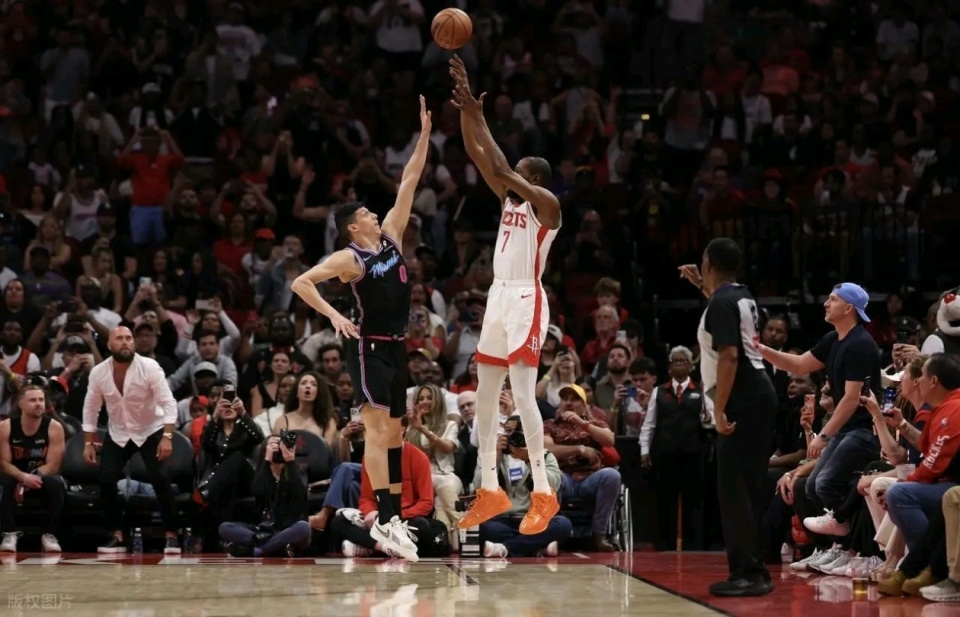 镜头转到休斯顿,火箭主场迎战热火,杜兰特赛前距离乔丹的生涯总得分只差25分。比赛末节,杜兰特右侧底角三分命中!这一球让的生涯总得分来到32294分,正式超越乔丹的32292分,升至历史得分榜第5位,丰田中心瞬间沸腾。