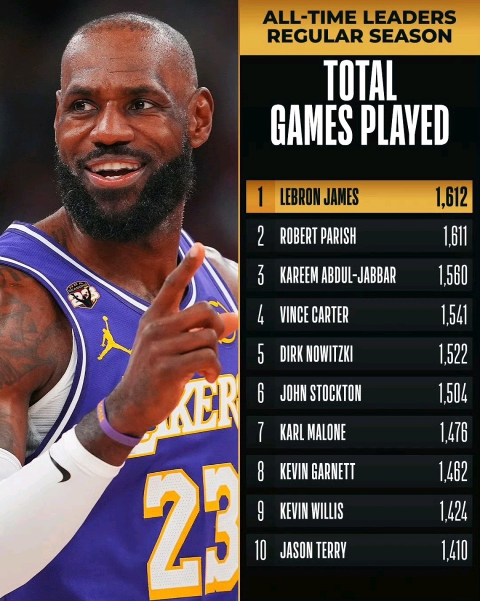 而这场比赛对41岁的詹姆斯意义非凡。这是他生涯第1612场常规赛,正式超越帕里什,独享NBA历史出场数第一的宝座。从2003年状元秀到如今第23个赛季,詹姆斯铸就了这项几乎不可能被打破的纪录。