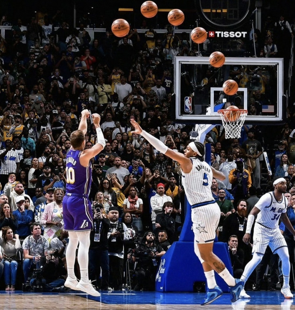湖人客场挑战魔术,比赛打得难解难分。最后时刻,魔术还领先1分,时间只剩2.6秒。暂停回来,斯马特底线发球,詹姆斯空切带走防守,左翼被放空的卢克-肯纳德接球就投,三分空心入网!只给魔术留下0.6秒。105-104,湖人惊险拿下9连胜。