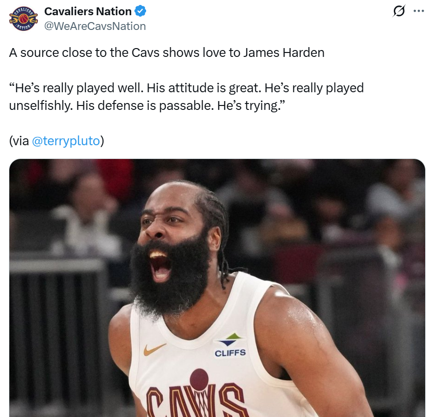 面对哈登这样的表现,骑士队内人士称赞到:“他打得真好,态度无可挑剔,打球非常无私,同时防守也达到了合格水平,能够看出他在全力以赴。”