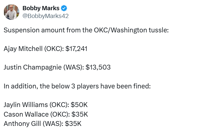 北京时间3月23日,NBA官方发布公告宣布,由于在周日两队的冲突事件中涉事,奇才队前锋贾斯汀-尚帕涅和雷霆队后卫阿贾伊-米切尔各被禁赛一场。联盟声明称,尚帕涅和米切尔因在场上发生冲突、激化斗殴行为,且冲突蔓延至观众席,被处以无薪禁赛。除两人遭禁赛外,雷霆内线球员杰林-威廉姆斯被罚款5万美元,雷霆后卫卡森-华莱士和奇才前锋安东尼-吉尔各被罚款3.5万美元,三人累计被罚12万美元。