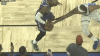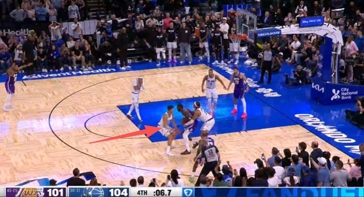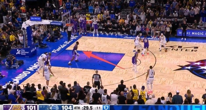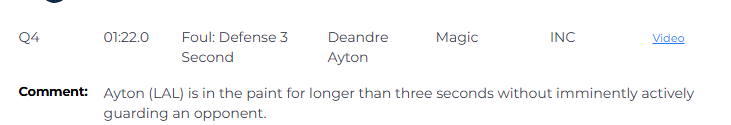 比赛最后1分22秒,艾顿在油漆区停留时间超过三秒,且未处于积极防守对方球员的状态,漏吹艾顿3秒违例,湖人获利,魔术吃亏。