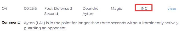 比赛最后25.6秒,艾顿在油漆区停留时间超过三秒,且未处于积极防守对方球员的状态,再次漏吹艾顿3秒违例,湖人再次获利。