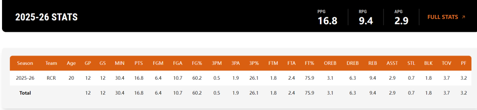 杨瀚森在G联赛的12场比赛,场均30.4分钟,拿到16.8分9.4篮板2.9助攻0.7抢断1.8盖帽,命中率60.2%,三分命中率26.1%,他的短板依旧是中远投射。