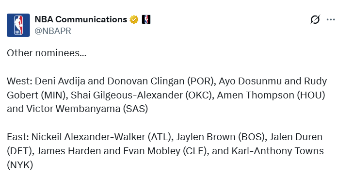 NBA官宣周最佳:东契奇蝉联三球首次当选 哈登阿门文班等人获提名