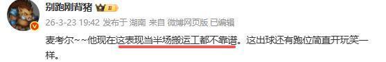 别跑刚背猪究竟批的是谁呢?没错,他批的是打首发的小外援麦考尔。本场在三个小外援中,表现最差的是麦考尔,他根本打不了控卫,很难串联球队,很难组织起有效的战术,多余动作太多太难看,突破又突不起,毫无杀伤力,全场只有两次罚球,可以说杀伤力为0。