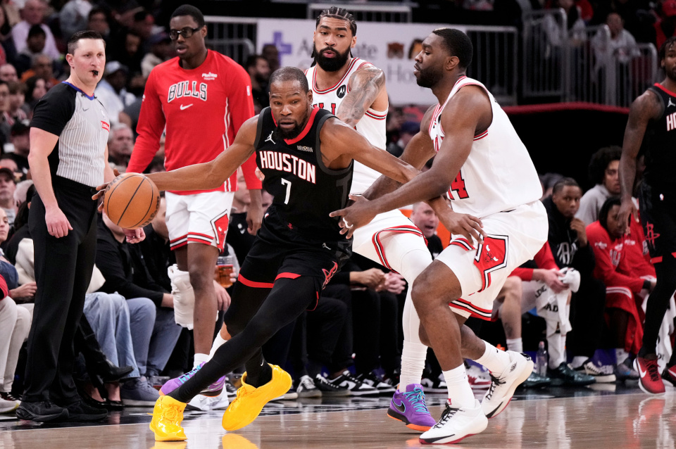 北京时间3月24日,NBA常规赛,火箭客场124-132不敌公牛。杜兰特本场比赛投篮23中15,三分10中5,罚球8中5,贡献40分7篮板5助攻,其中末节个人独得15分,携手申京33分13篮板10助攻,帮助火箭从上半场最多落后22分到末节实现比分反超,最后时刻死神连续挥舞镰刀命中续命三分。然而,火箭无法阻挡公牛的进攻攻势,杜兰特最后时刻出现致命进攻犯规无缘率队逆转,最终火箭被掘金、森林狼战绩反超掉至西部第6。