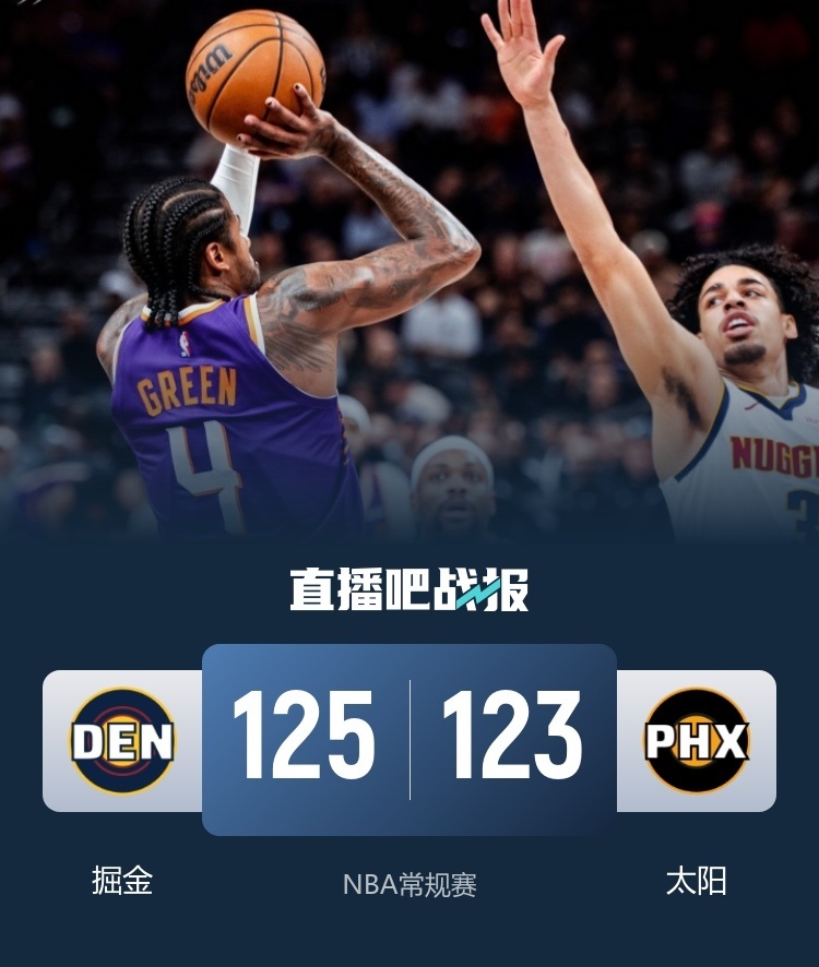 易边再战,比赛形势再次转化,太阳重新找到外线手感,单节拿到38分蚕食分差,三节结束掘金97-95领先。末节回来,双方陷入拉锯战,交替取分,比赛悬念维持到最后一刻,约基奇在还剩11秒时抛投打进,布克绝杀三分不中,掘金125-123险胜太阳。
