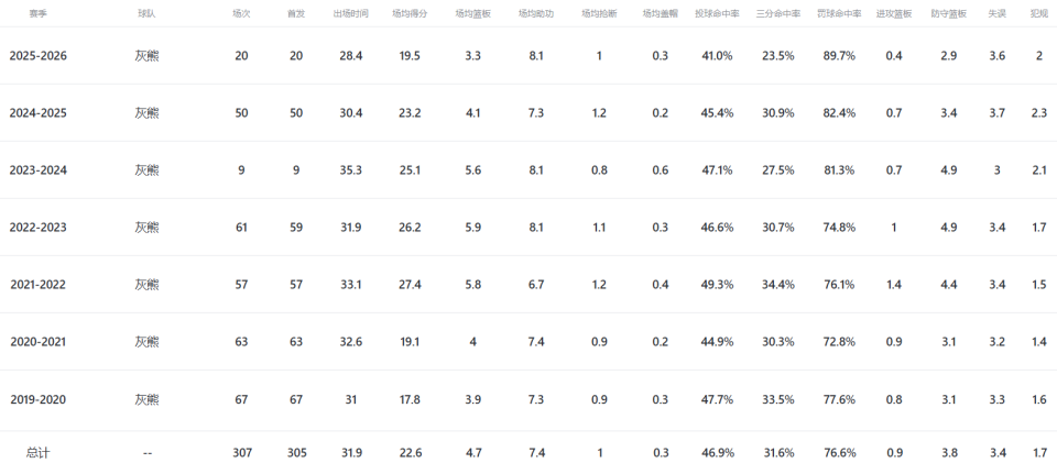 本赛季莫兰特只打了20场比赛,场均上阵28.5分钟得到19.5分3.3板8.1助1断,三项命中率41%、23.5%和89.7%,多项数据均是个人生涯新低,年仅26岁的他却就掉出全明星行列,毫无疑问乃近几年最让人失望的球员之一。