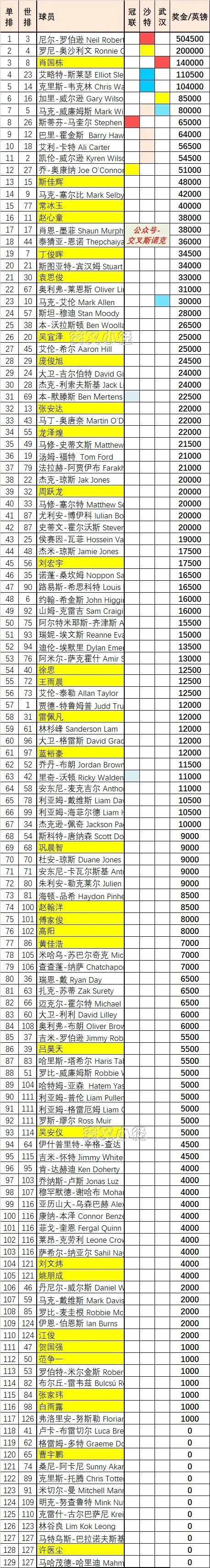 (2)只计入排名赛的排名奖金。不包含邀请赛奖金、单杆最高奖、147奖金、球员在其首轮出局后不计入排名的实获奖金等。