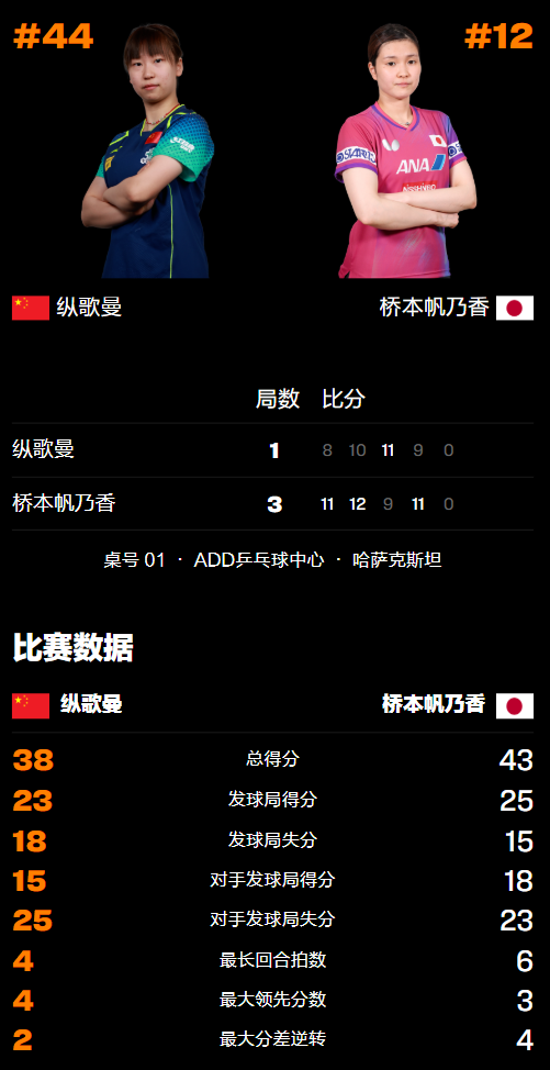 1998年出生的桥本帆乃香是目前世界女乒的头号削球手,最新世界排名第12位,在近一年多时间里15次与中国队运动员交手,赢了其中的13次,仅输世界排名前二的孙颖莎、王曼昱各1场,今年就和纵歌曼交手1次,结果3-0大获全胜,此战国乒小将面临严峻考验。